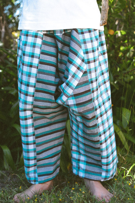 At the heart of Little Cousin is the Signature Cousin Pant, designed and constructed by the Puangthong family in Bangkok, Thailand. These pants are made from upcycled Pha Khao Ma fabric, a traditional Thai textile known for its vibrant checkered patterns. Pha Khao Ma isn't just a fabric; it's a piece of Thai culture and history.