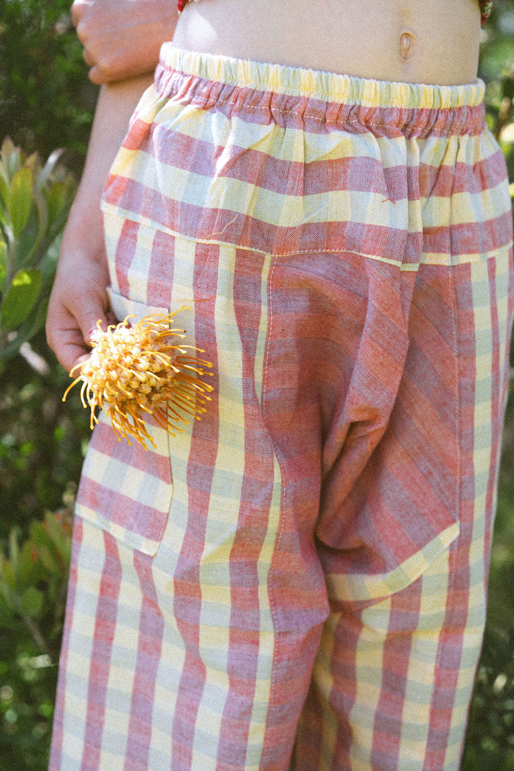 Robust, light-weight, stress-free. The Little Cousin signature fisherman pants are comfy, have a box silhouette for moveability and airflow, elasticised waist for smooth putting-on and taking-off, three-quarter cut for ploughing through puddles and large pockets for collecting favourite things.